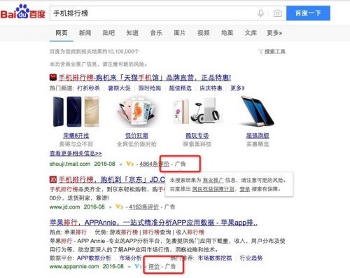 作为受影响最大的百度搜索,TechWeb查询发现,目前百度的搜索结果页面的广告样式已经由原来的“商业推广”变成“广告”二字描述了。