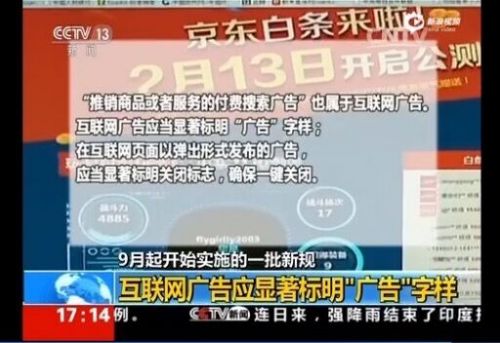 9月1日起,由国家工商总局发布的《互联网广告管理暂行办法》将正式生效。办法明确界定了互联网广告,要求互联网广告应当具有可识别性,在显著位置标明“广告”字样。