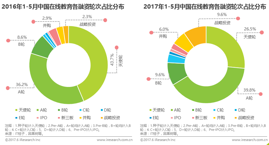 2017年较2016年同期出现大幅增长的是并购和战略投资次数,其占比分别由原来的2.9%和2.3%增长为6.0%和9.6%,这表明行业内并购频次增加,诸多在线教育领头企业开始通过并购的方式扩大自己的产品线或业务范围。同时,企业间的战略投资增加,行业上下游或行业内企业间合作共赢局面开始雏形。