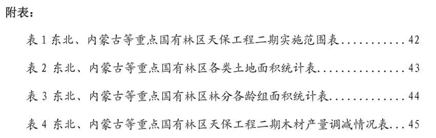 要这个文件的附表,尤其是“表1 东北、内蒙古等重点国有林区天保工程二期实施范围表”